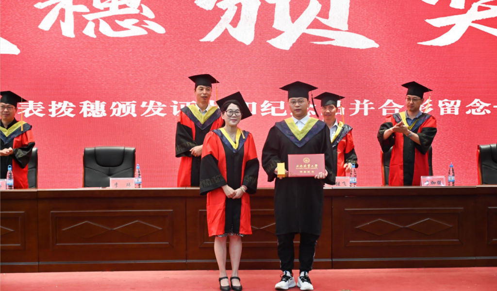 经理李玮为38名毕业生代表拨穗、颁发学位证书和纪念品。公司党委副书记陈继飞鼓励毕业生尽快就业、尽早就业,即将毕业离校之际提醒大家做好安全防护。